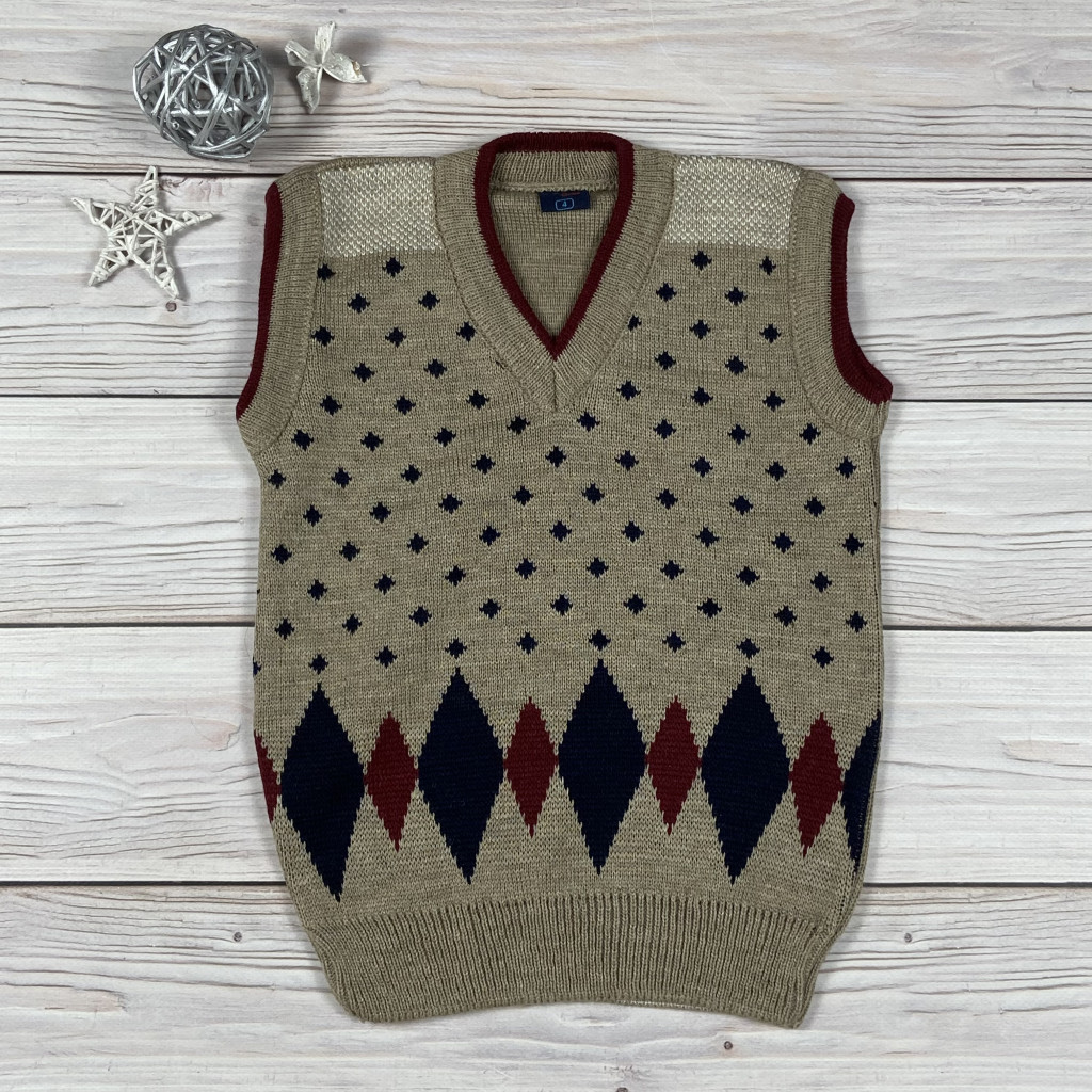 Bézs színű mintás belebújós kisfiú kötött mellény