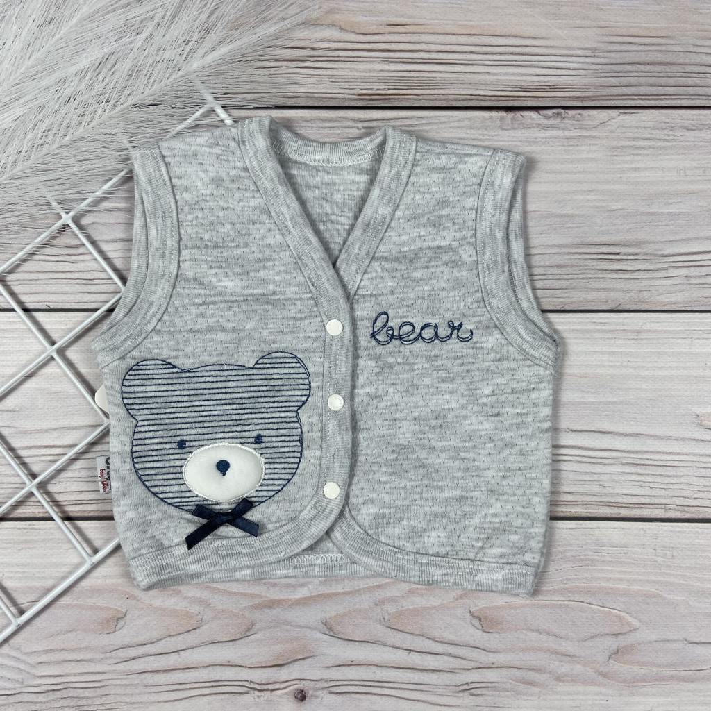 Macis mintájú, szürke színű, enyhén vastagabb pamut mellény. Elől patentos