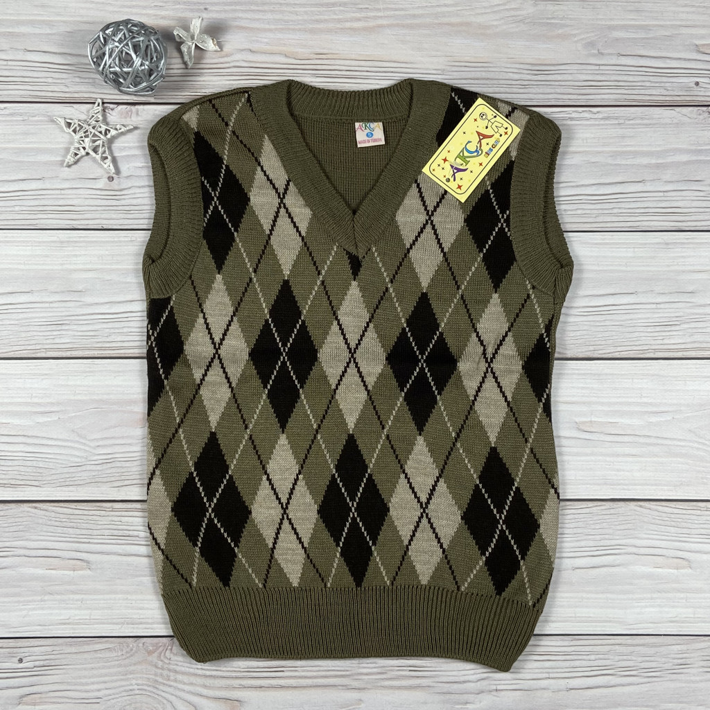 Olívazöld rombuszmintás belebújós kisfiú kötött mellény