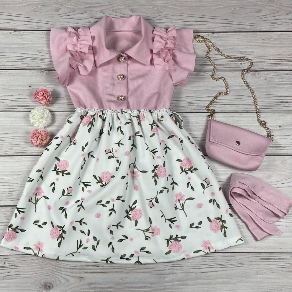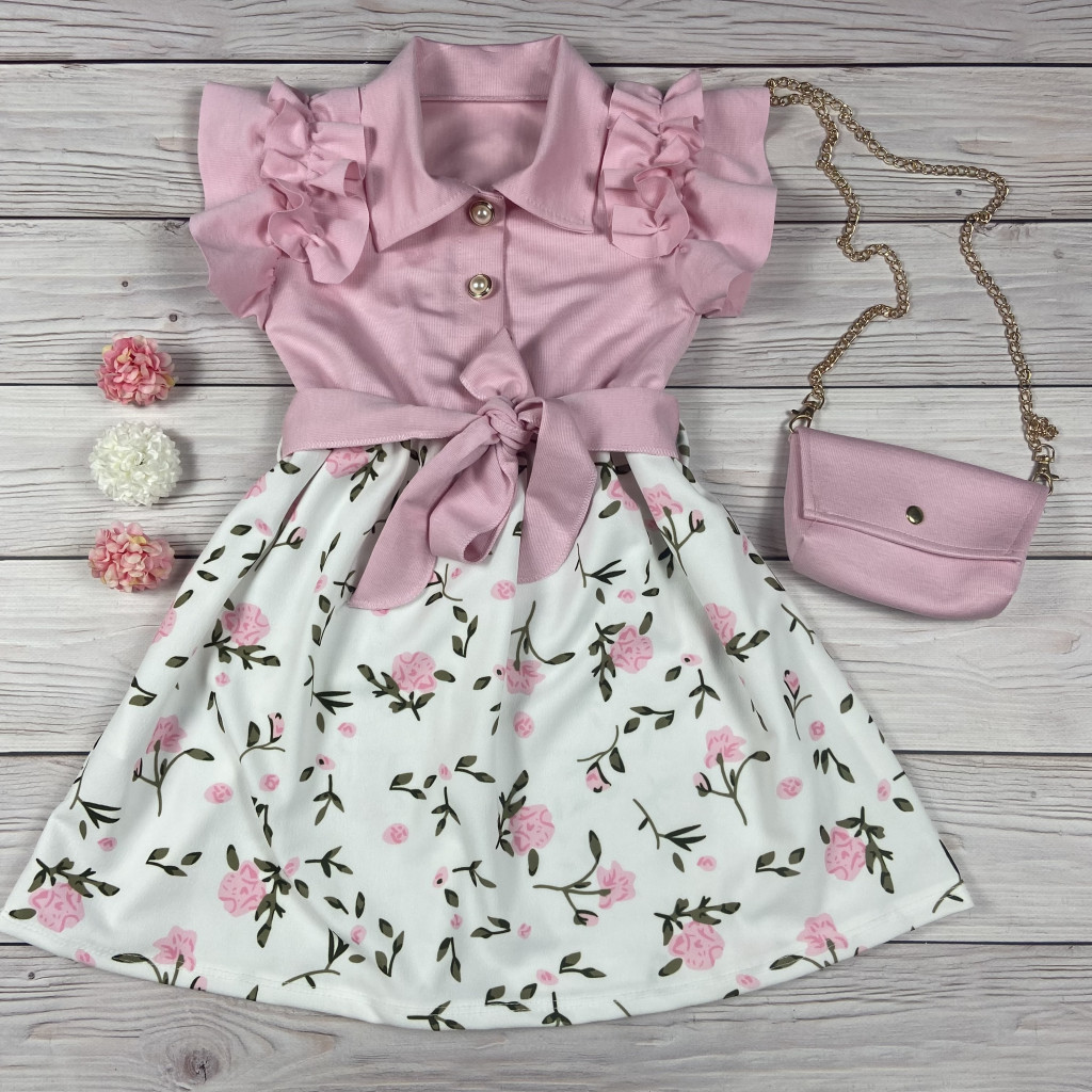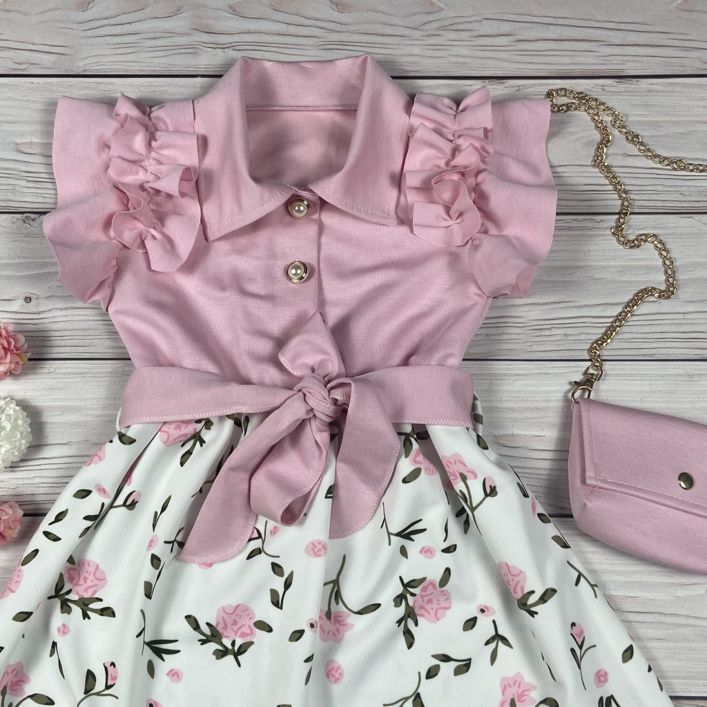 Rózsaszín virágmintás kislány ruha fodros ujjakkal, övvel és táskával