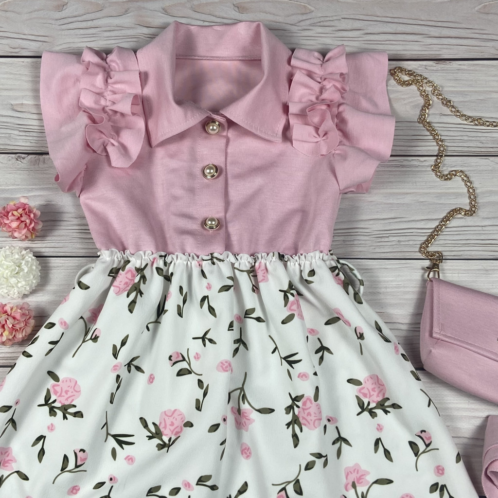 Ez a romantikus stílusú, rózsaszín kislány ruha igazi kedvenc lehet a tavaszi és nyári szezonban. A felsőrész elegáns galléros kialakítással és díszgombokkal készült, amelyet a vállrészen található látványos fodrok tesznek különlegessé és igazán bájossá.