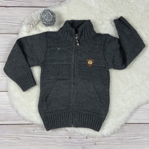 Sötétszürke kötött kisfiú kardigán. Elől végig cipzáras, zsebes