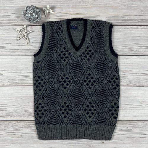 Szürke-mélykék rombuszmintás belebújós kisfiú kötött mellény