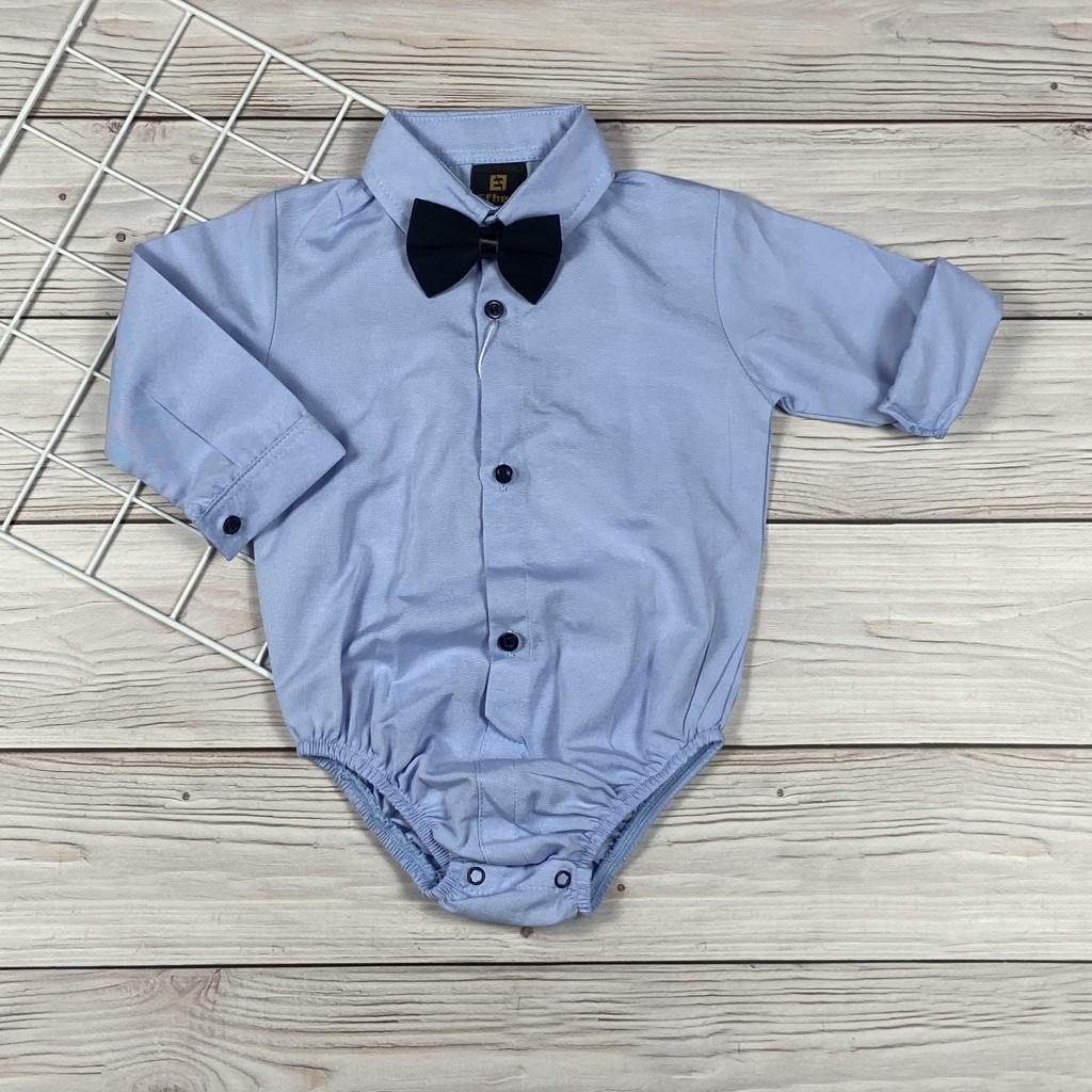 Stílusos, ing fazonú kisfiú body, amely tökéletes választás alkalmakra, ünnepekre vagy fotózásra. A body galléros kialakítású, elöl gombos, és egy gumis, levehető mélykék csokornnyakendő díszíti, így egyszerre elegáns és kényelmes viselet.