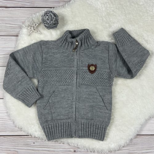 Világosszürke kötött kisfiú kardigán. Elől végig cipzáras, zsebes