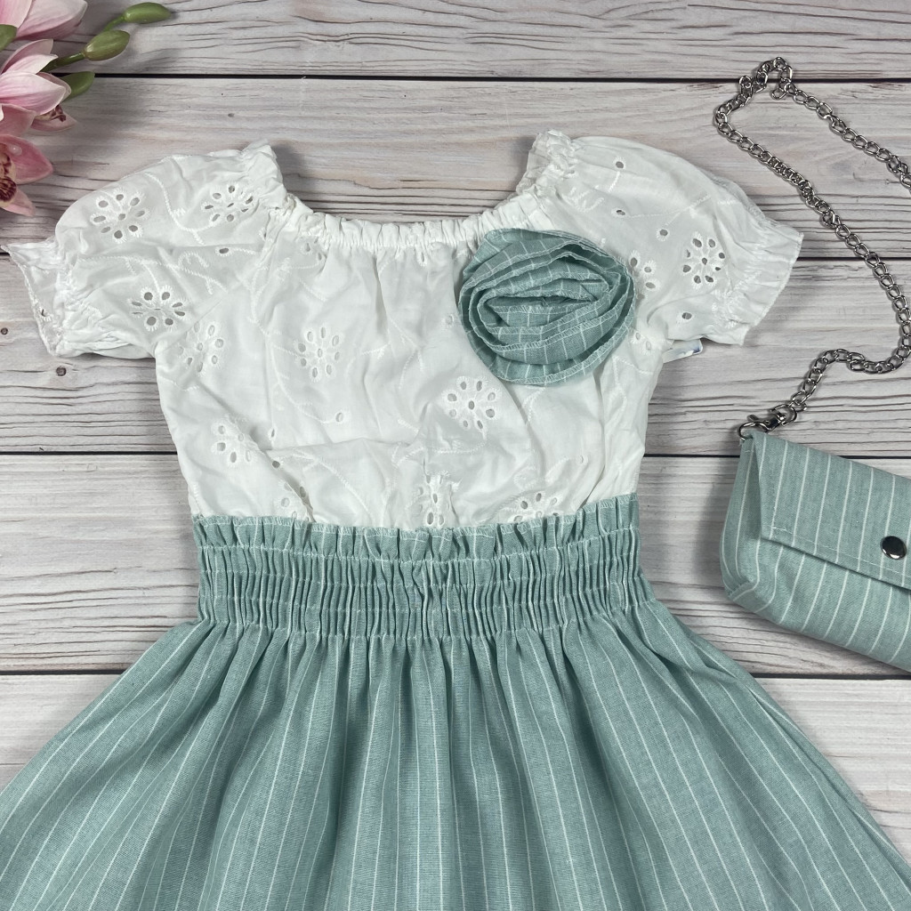 Zöld csíkos kislány ruha hímzett felsőrésszel, táskával